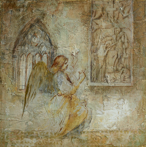 Much of this mixed media work is on cradled plywood panels, allowing layers of paint, collage (including handprinted tissue and vintage ephemera) asemic writing and mark making to be built up and then excavated, revealing unexpected marks and colours. This creates a fascinating to-and-fro play between random ‘happenings’ and a restoring of ‘order’ and builds a rich layer of texture, a palimpsest of thoughts and process.